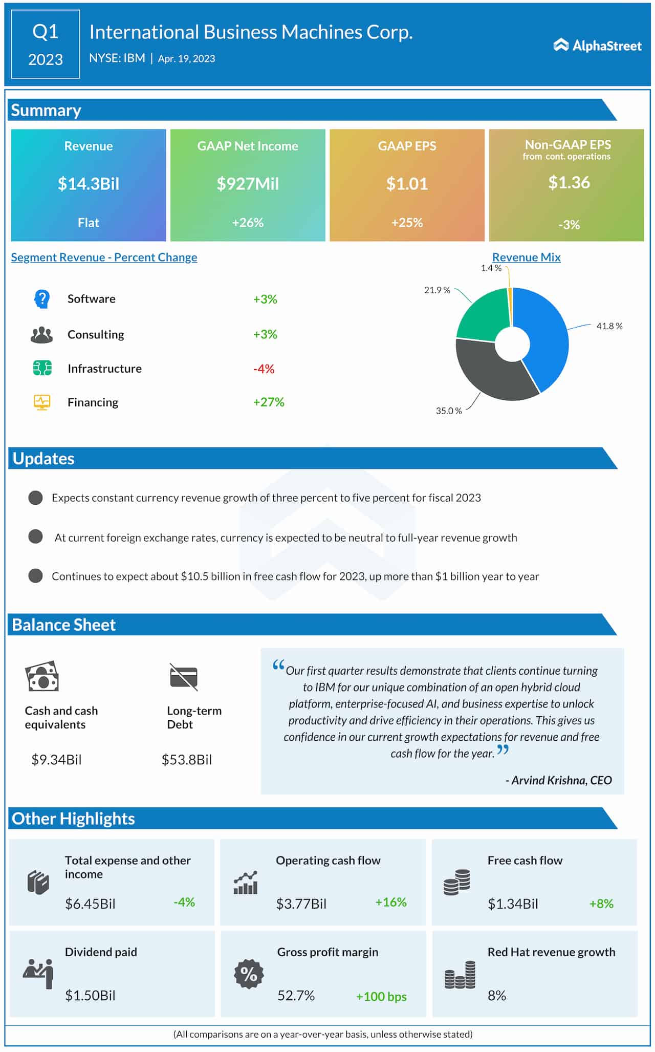 The IBM leadership is looking to end the fiscal year with a healthy free cash flow of $10.5 billion, which is up by $1 billion compared to last year. It also predicts a 3-5% growth in full-year revenues. CFO James Kavanaugh said at the last earnings call, “Looking at the second quarter, we expect first to second-quarter revenue seasonality to be fairly consistent with last year. That’s up about $1.3 billion, though the underlying dynamics are different due primarily to Z Systems’ product cycle and currency. I’ll remind you, we had a successful launch of our z16 in the second quarter of last year, and that creates a year-to-year headwind to growth of about 3 points. In terms of profit, we now expect a little over one-third of our operating net income in the first half and just under two-thirds in the second half.”