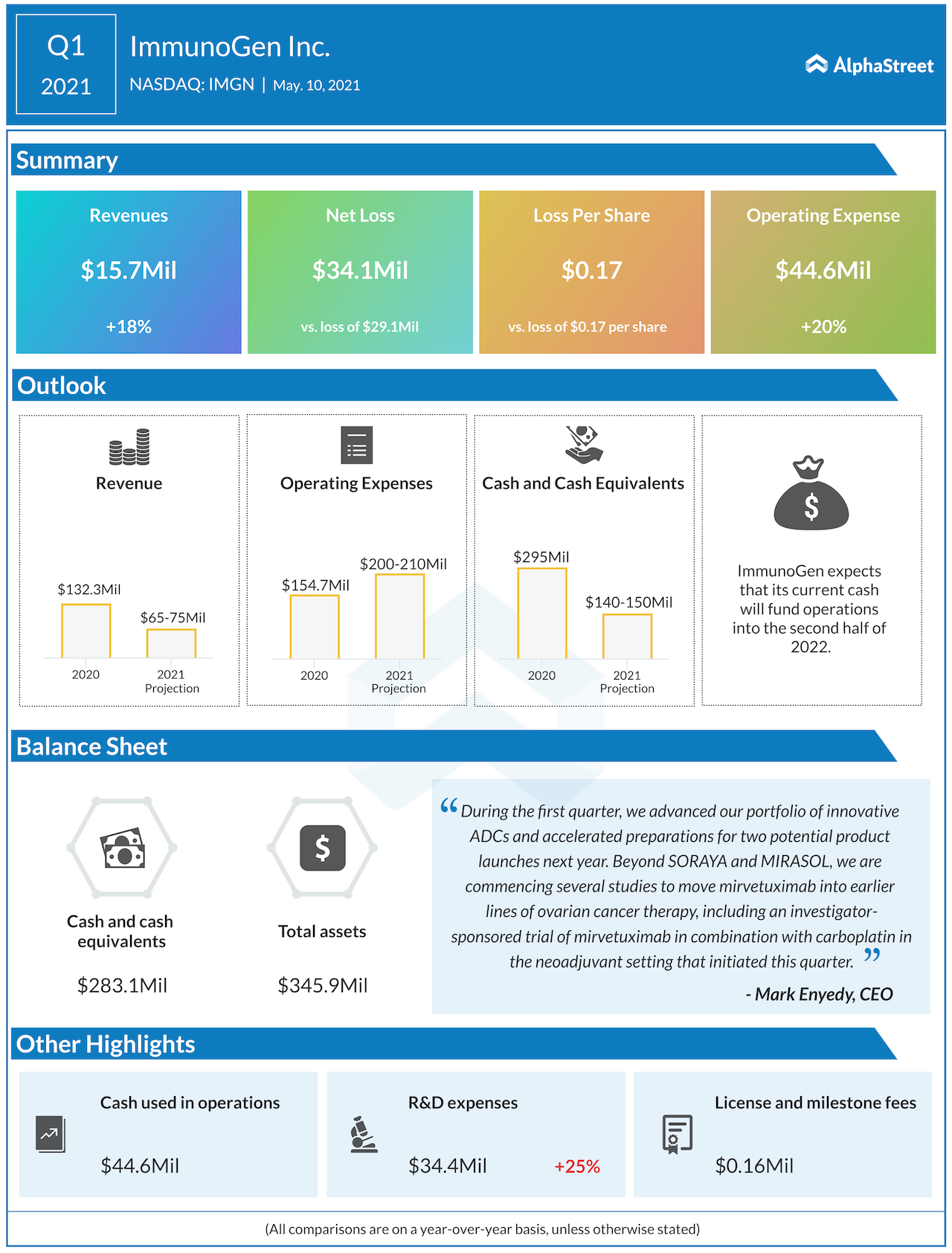 ImmunoGen CFO Susan Altschuller said in an email interaction with AlphaStreet, “This was effectively a 6-week delay in patient accrual, so we do not anticipate any material impact on our expenses. Accordingly, as outlined on our call, there is no change to our guidance.”