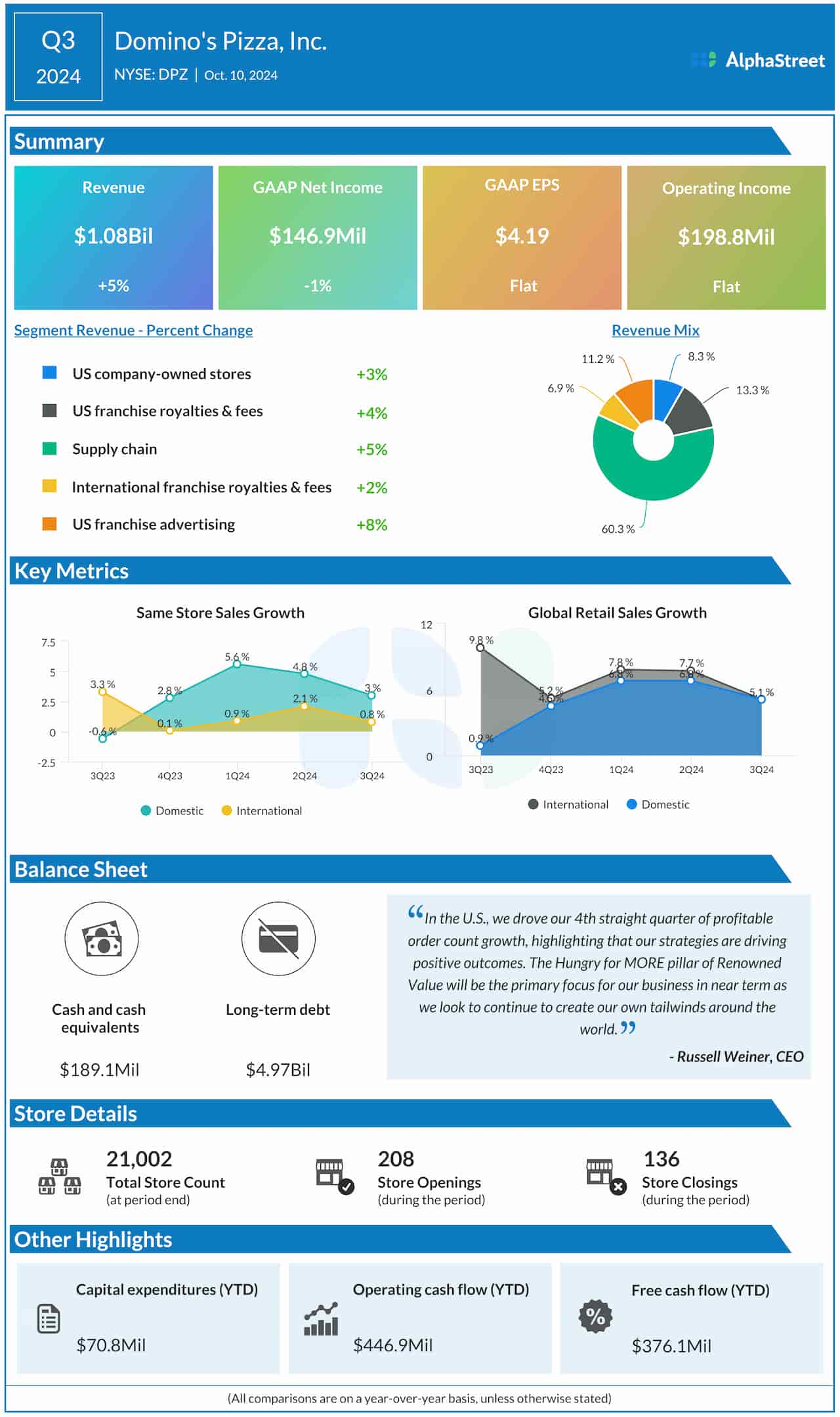 Domino’s Pizza, Inc. (NYSE: DPZ) reported mixed results for the third quarter of 2024, with earnings beating and revenues slightly missing estimates. The company has been able to improve its market share despite adverse operating conditions, including high inflation and cutbacks on discretionary spending by consumers. It banks on menu innovation and aggressive promotional pricing to tackle current headwinds.