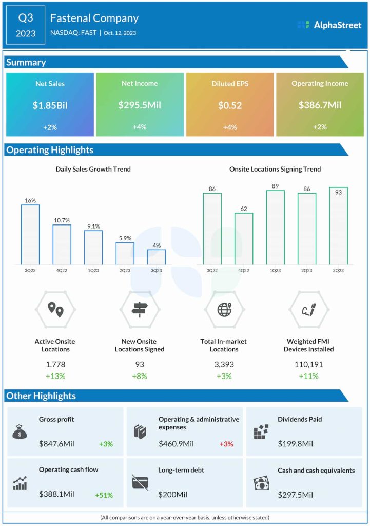 In the third quarter, Fastenal’s net income came in at $295.5 million or $0.52 per share, compared to $284.6 million or $0.50 per share in the corresponding period of 2022. Earnings beat analysts’ forecasts, continuing the long-term trend. Margins benefitted from higher prices and moderation in freight costs due to supply chain improvements.