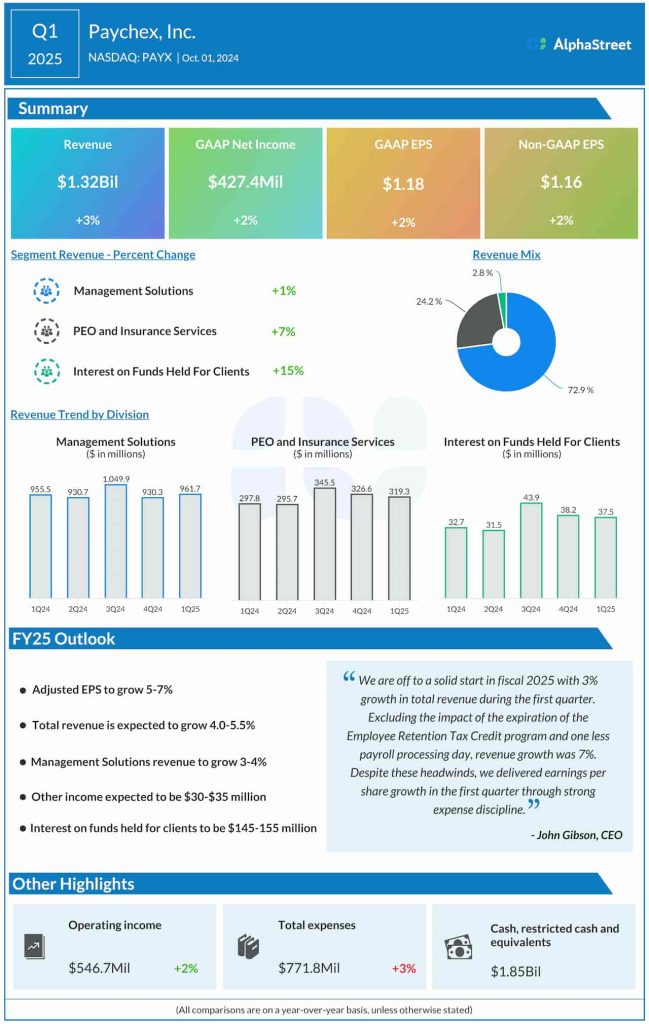 In the November quarter, revenues grew by 5% annually to $1.32 billion, marginally beating analysts’ estimates. There was a 3% revenue growth in the core Management Solutions division amid a continued uptick in client count. That translated into an increase in adjusted net earnings to $1.14 per share in Q2 from $1.08 per share in the same period of 2024. Including special items, earnings were $413.4 million or $1.14 per share, up from last year’s profit of $392.7 million or $1.08 per share.