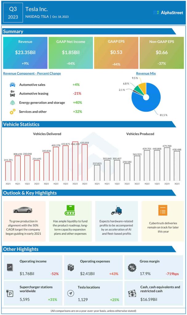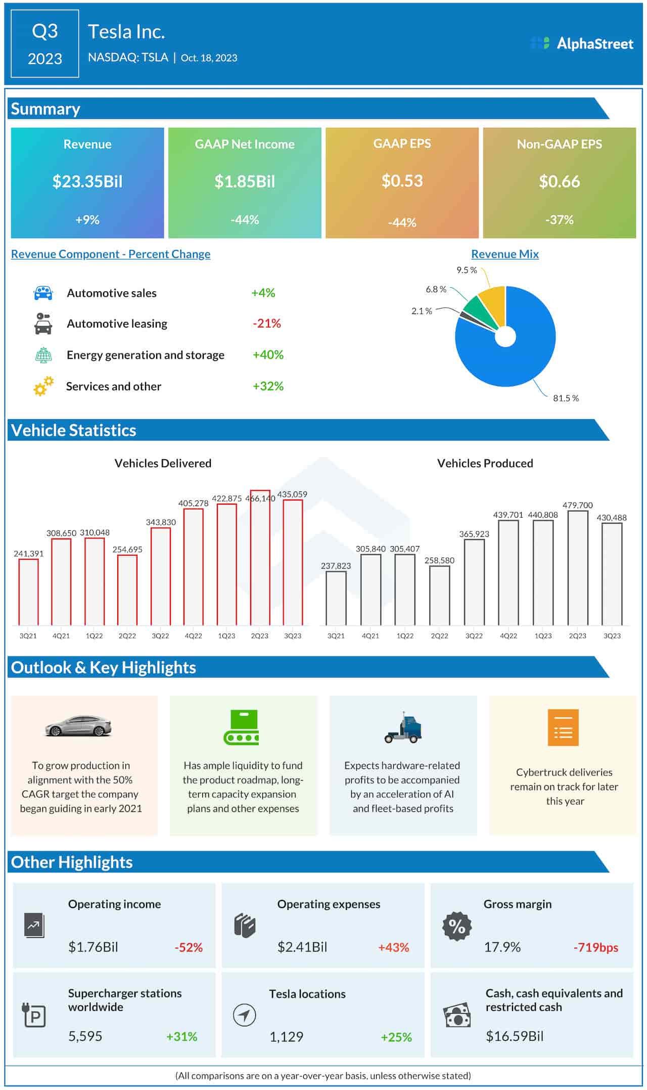 The Austin-based car maker reported revenues of $23.4 billion for the third quarter, which is up 9% year-over-year. It produced a total of 430,488 vehicles during the three-month period and delivered 435,059 units, which is lower than the prior-quarter numbers.
