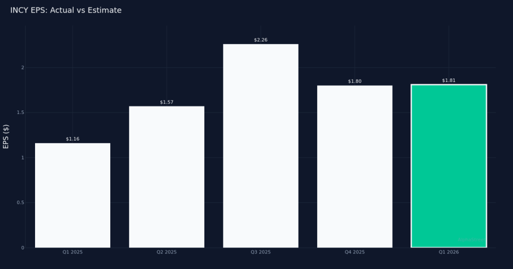 Incyte Corporation crushed first-quarter expectations, posting non-GAAP diluted earnings per share of $1.81 that topped Wall Street’s $1.40 estimate by 29.3%. The biopharmaceutical company, which focuses on discovering and commercializing therapeutics across the United States, Europe, Canada, and Japan, generated $1.27B in revenue for the quarter while earning $374.4M in adjusted net income.