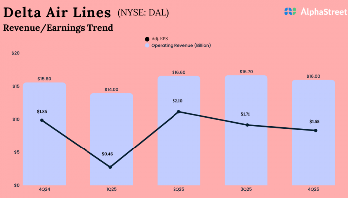 Delta Air Lines (NYSE: DAL) reported its fourth quarter 2025 earnings results today. Total operating revenue increased 3% year-over-year to $16 billion.