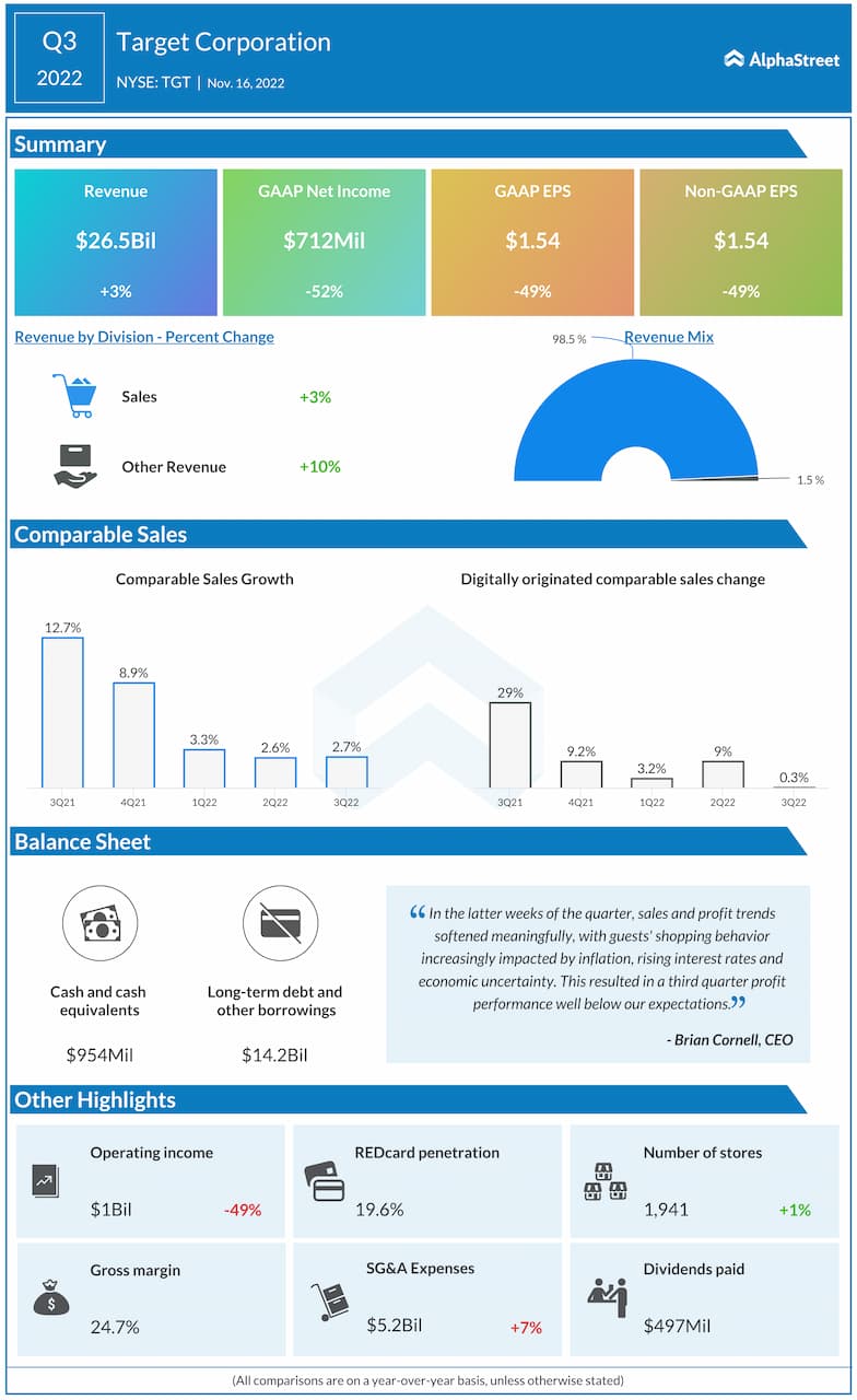 “…Target’s exclusively owned brands provide tremendous quality at incredibly competitive prices, a great combination anytime, but never more so than in an inflationary environment. So, as we turn our focus to Q4, we’ll do what we always do: work tirelessly to deliver value and solutions to our guests while also delivering affordable joy at a time when they need it most. As we’ve outlined this morning, we’re taking a prudent approach to our inventory planning and sales expectations for the fourth quarter in light of the concerning industry trends we’ve seen over the past several weeks,” said Target’s CEO Christina Hennington at the last earnings call.