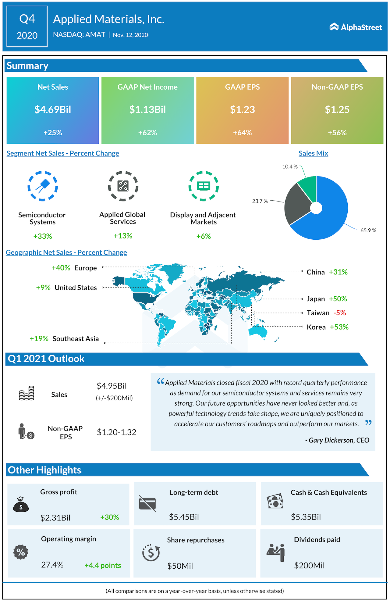 Applied Materials (NASDAQ: AMAT) reported fourth-quarter 2020 financial results after the closing bell on Thursday. The manufacturing giant reported Q4 revenue of $4.69 billion, up 25% year-over-year and higher than the Wall Street projection. Net income of $1.25 per share was much better than what analysts had anticipated.