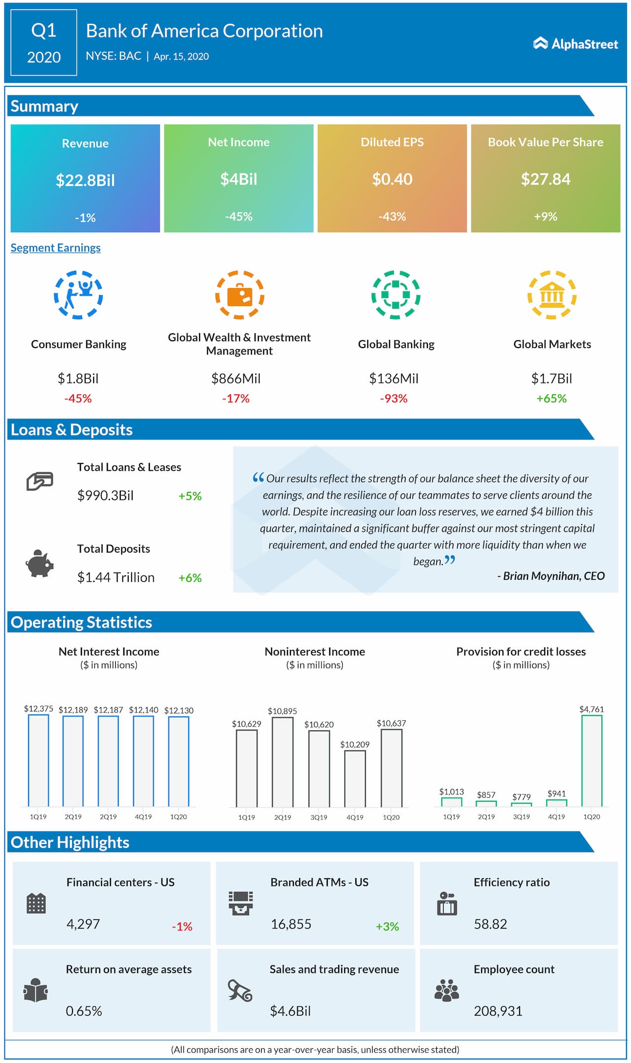 Bank of America (NYSE: BAC) reported a 45% dip in earnings for the first quarter of 2020 due to the inclusion of higher provision expense for COVID-19 related reserve build. During the quarter, the company suspended its buyback program to provide additional support to the economy.
