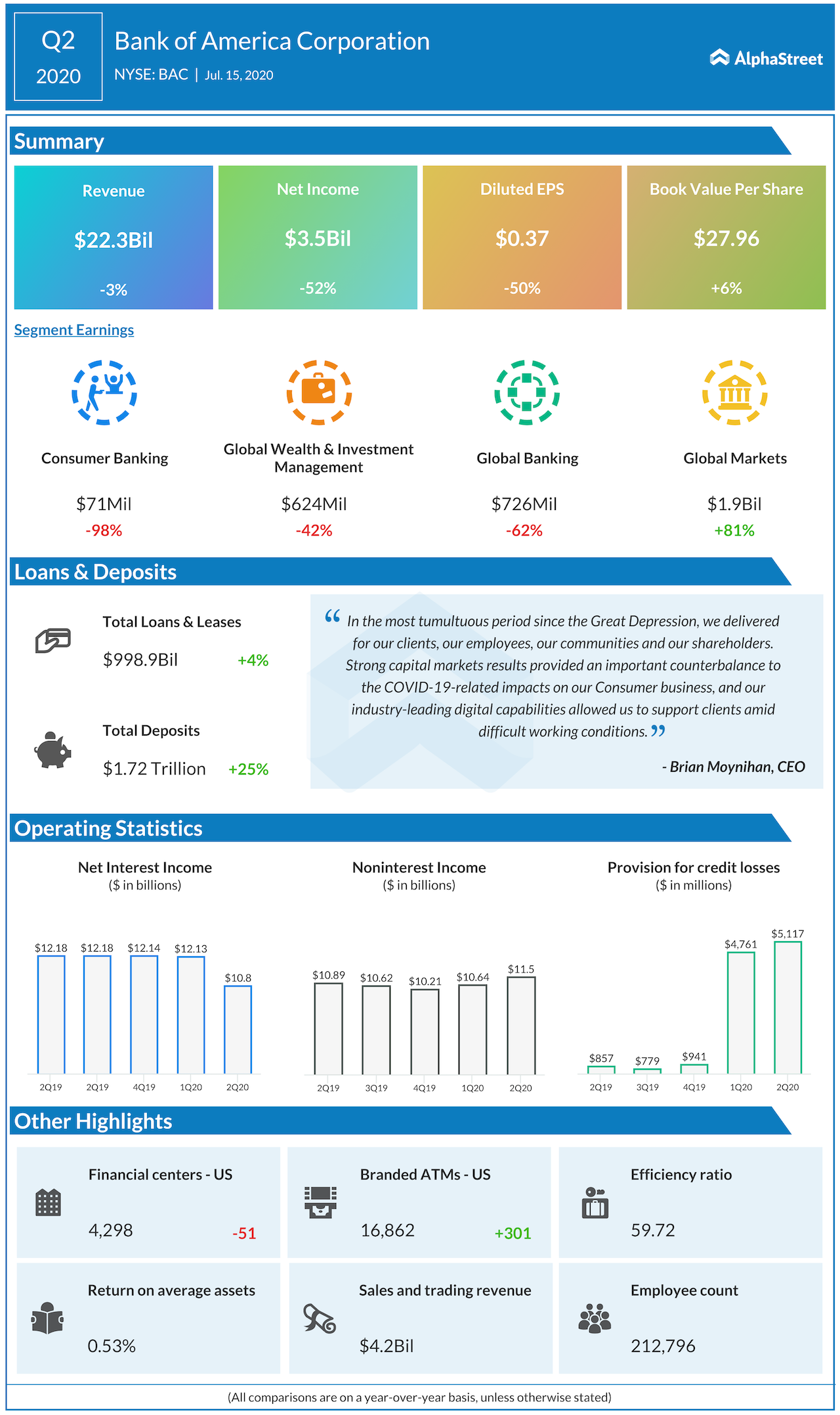 CEO Brian Moynihan said in a statement, “We provided billions in credit to clients; announced a $1 billion, four-year commitment to drive economic and racial equality in our communities.”
