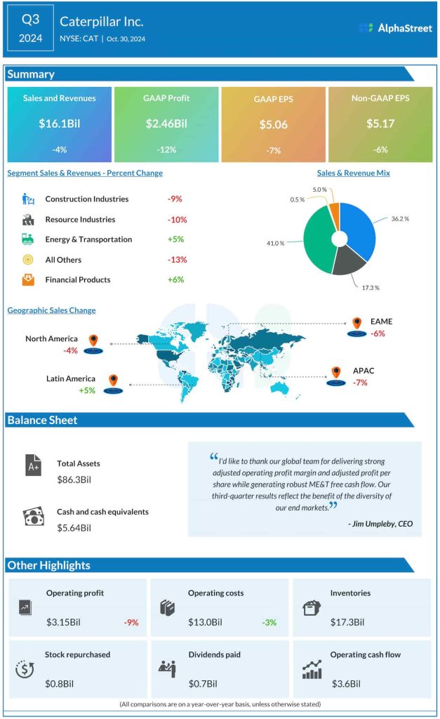 Sales and revenues for the September quarter were $16.1 billion, compared to $16.8 billion in the same period of 2023. Higher sales in the Energy & Transportation segment were more than offset by a decline in the Construction division.