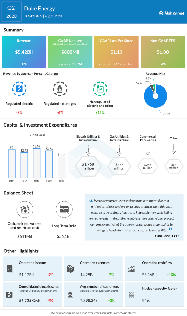 Duke Energy (NYSE: DUK) reported second-quarter financial results before the market opened on Monday. The energy holding company surpassed earnings expectations by 5 cents per share during the quarter.