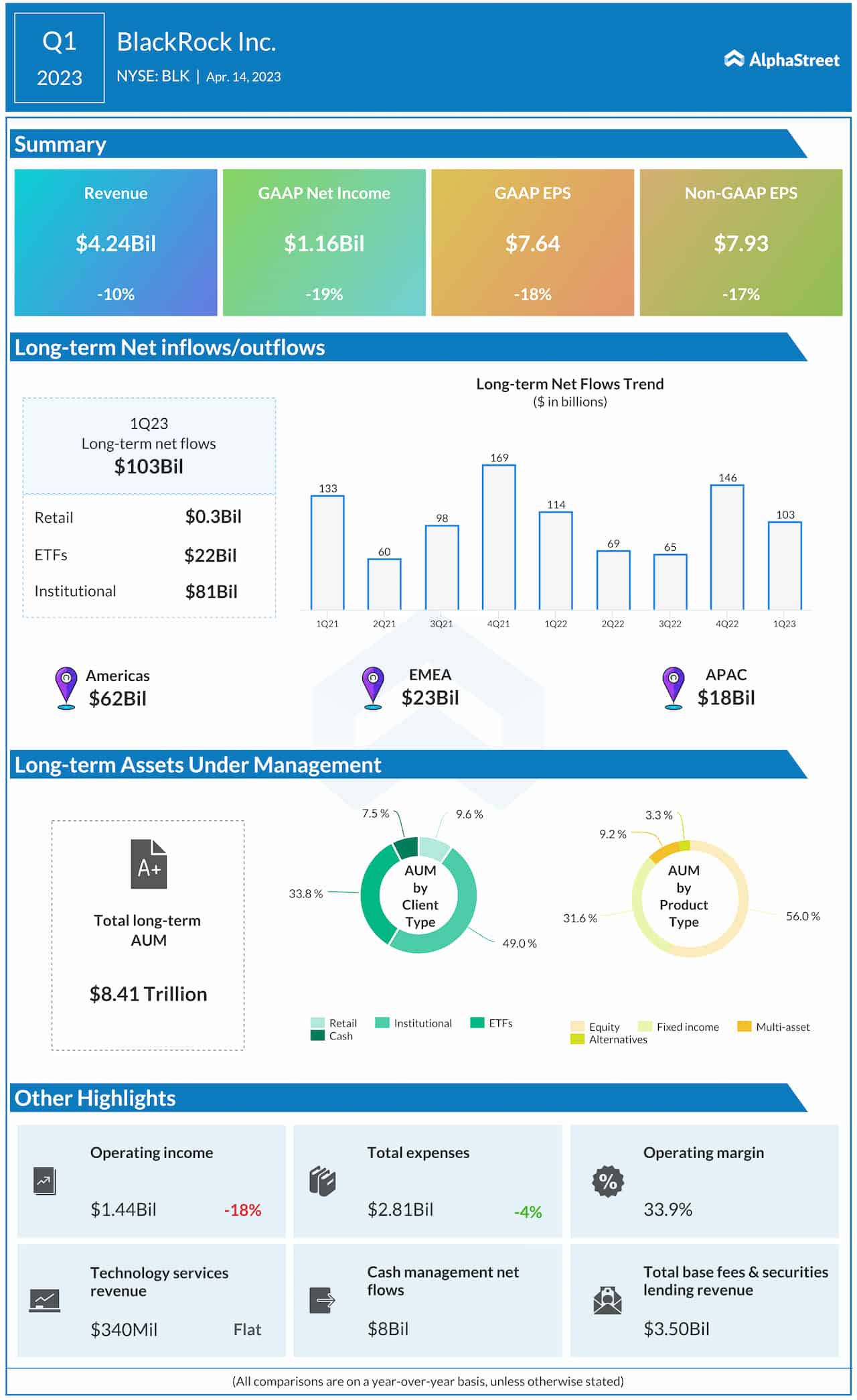 Total revenue decreased 10% year-over-year to $4.24 billion, due to the impact of significantly lower markets and dollar appreciation on average AUM and lower performance fees. Total long-term assets under management as of the first quarter were $8.41 trillion. Long-term net flows totaled $103 billion.