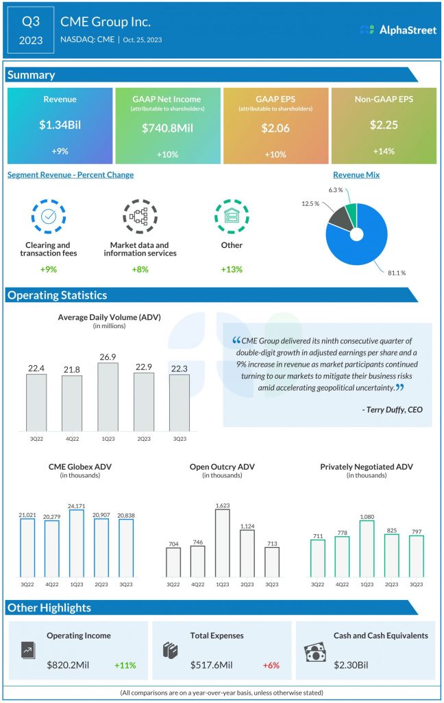 Net income attributable to common shareholders of CME Group was $740.8 million, or $2.06 per share, compared to $671.1 million, or $1.87 per share, last year. Adjusted EPS was $2.25.