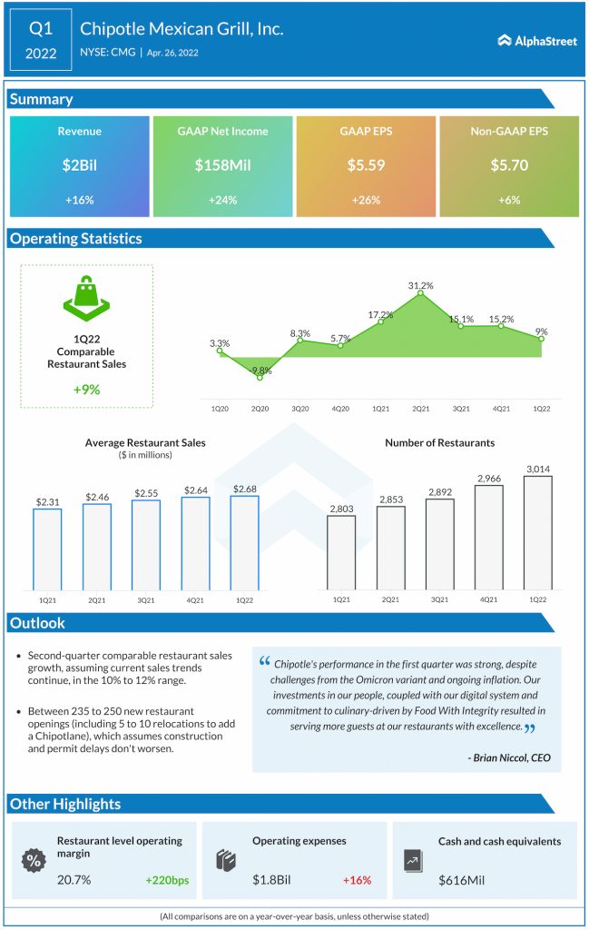 Fastfood chain Chipotle Mexican Grill (NYSE: CMG) Tuesday posted its first-quarter 2022 earnings results.