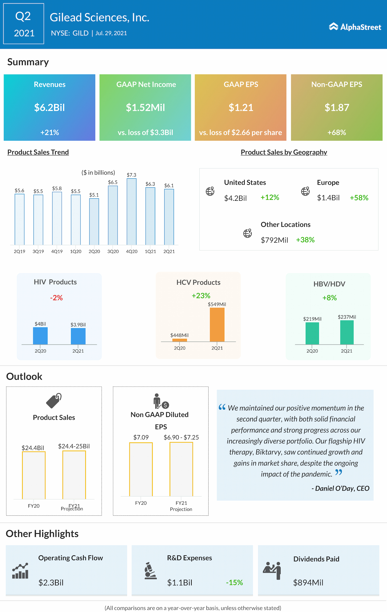 Biopharmaceutical company Gilead Sciences Inc (NASDAQ: GILD) reported its second-quarter 2021 earnings today after the closing bell.