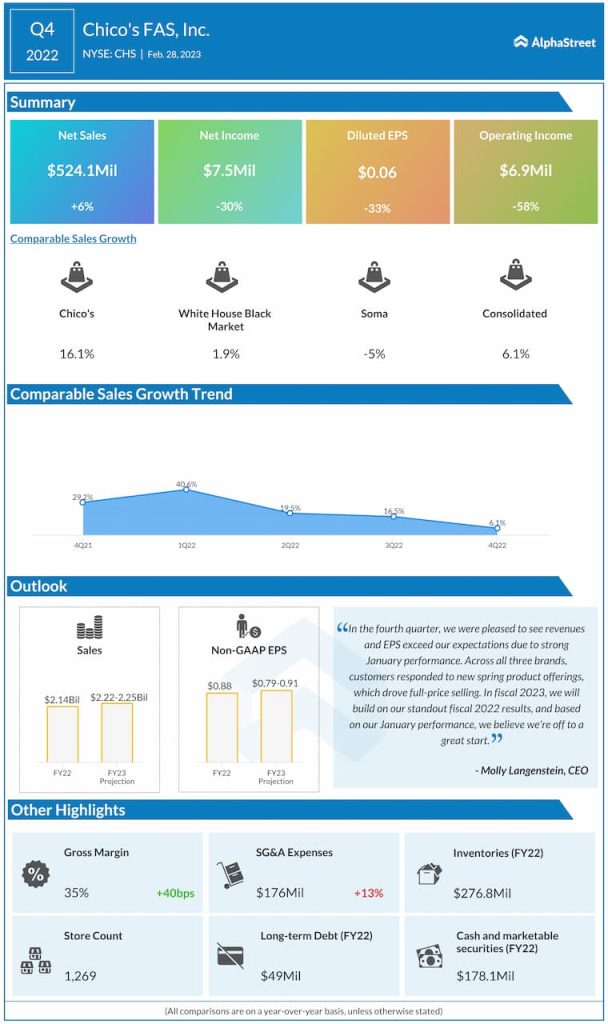 Chico’s FAS, Inc. (NYSE: CHS) reported fourth quarter 2022 earnings results today.