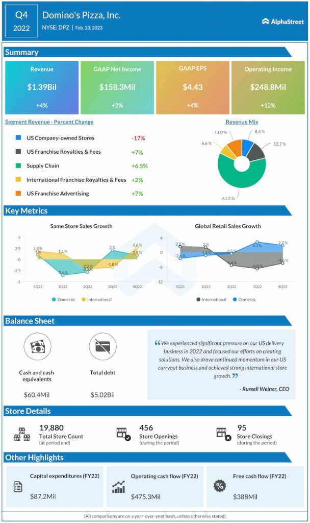Domino’s Pizza, Inc. (NYSE: DPZ) reported fourth quarter 2022 earnings results today.