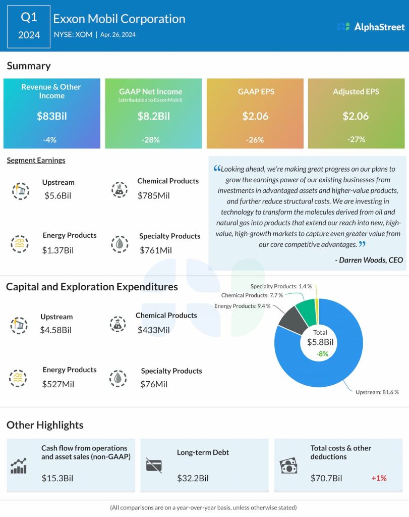 Net income attributable to ExxonMobil was $8.2 billion, or $2.06 per share, compared to $11.4 billion, or $2.79 per share, last year. Adjusted EPS was $2.06.