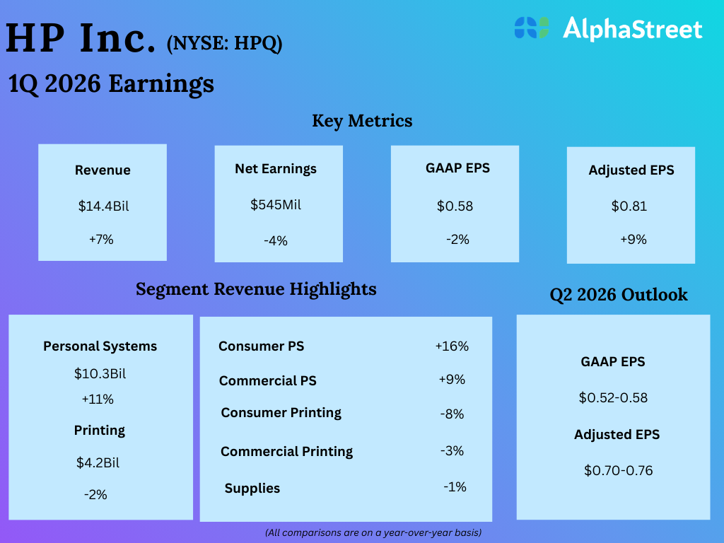 HP (NYSE: HPQ) reported net revenue of $14.4 billion for the first quarter of 2026, up 6.9% year-over-year.