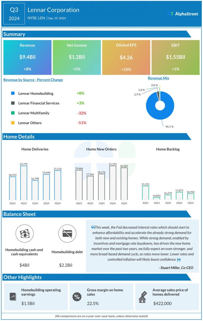 New orders increased 5% to 20,587 homes while deliveries increased 16% to 21,516 homes in Q3. The average sales price of homes delivered was $422,000. The company ended the quarter with a backlog of 16,944 homes at a dollar value of $7.7 billion.