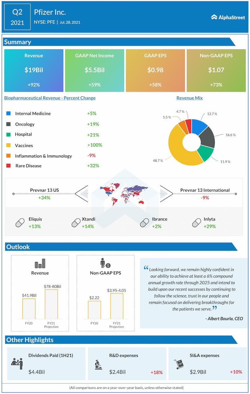 Pfizer Inc. (NYSE: PFE) reported second quarter 2021 earnings results today.