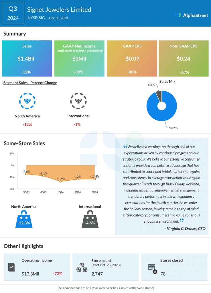 Signet expects total sales of $2.40-2.60 billion for the fourth quarter of 2024 and $7.07-7.27 billion for the full year of 2024. EPS for FY2024 is expected to range between $9.55-10.18.