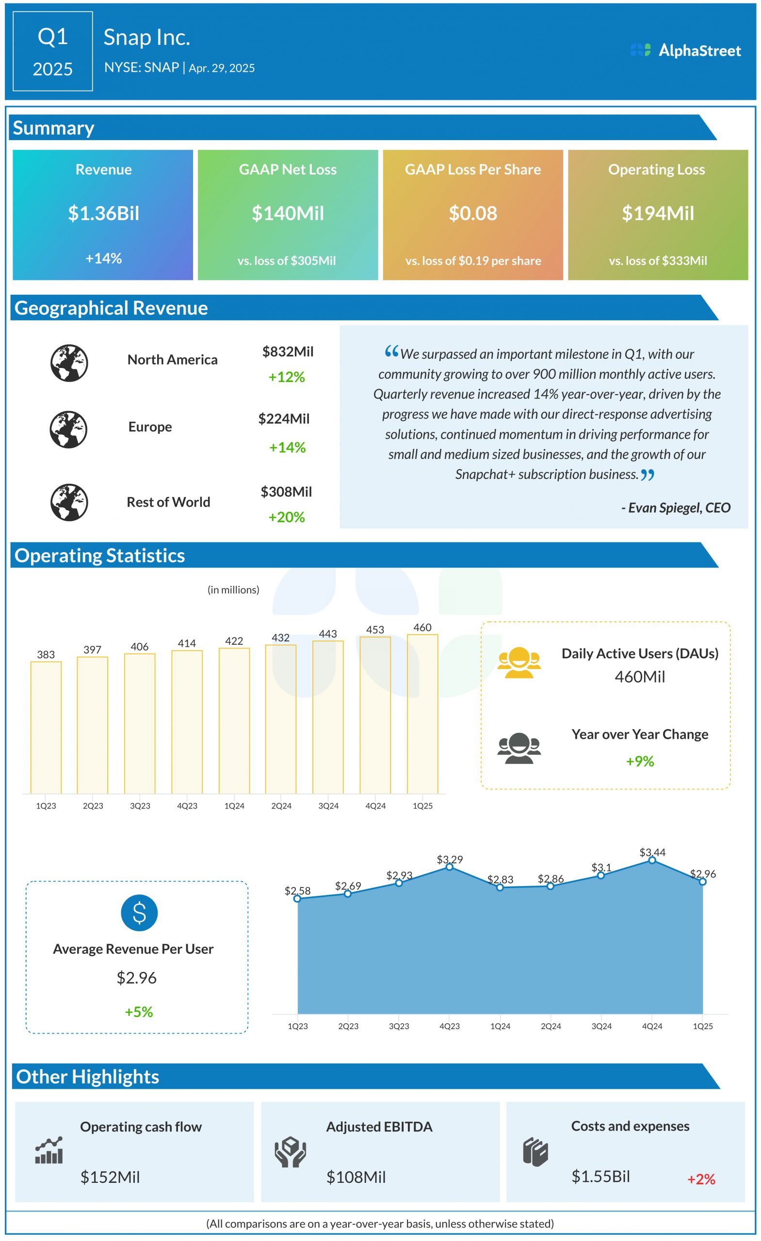 Daily active users (DAU) increased 9% YoY to 460 million in Q1.