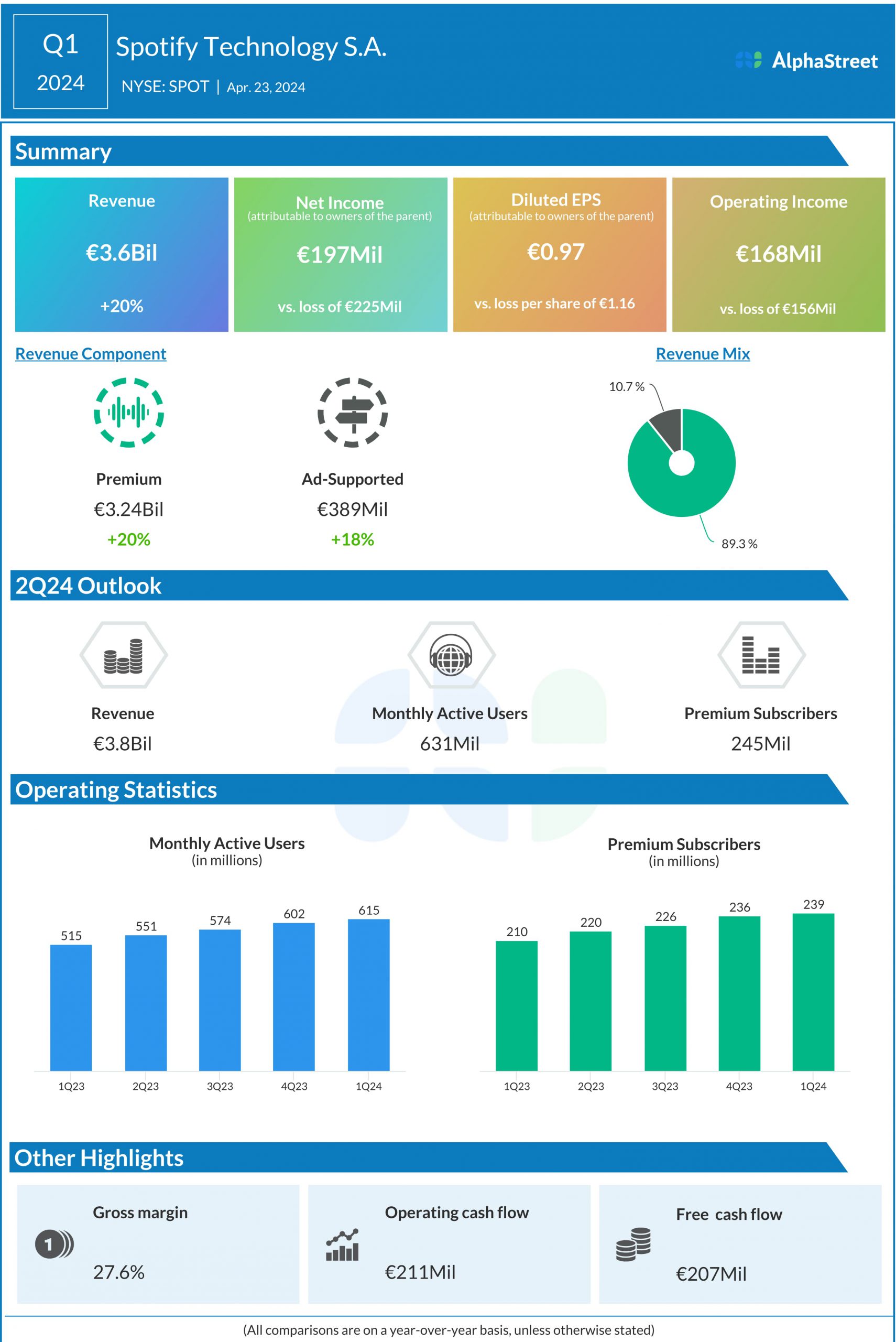 Spotify Technology S.A. (NYSE: SPOT) reported first quarter 2024 earnings results today.