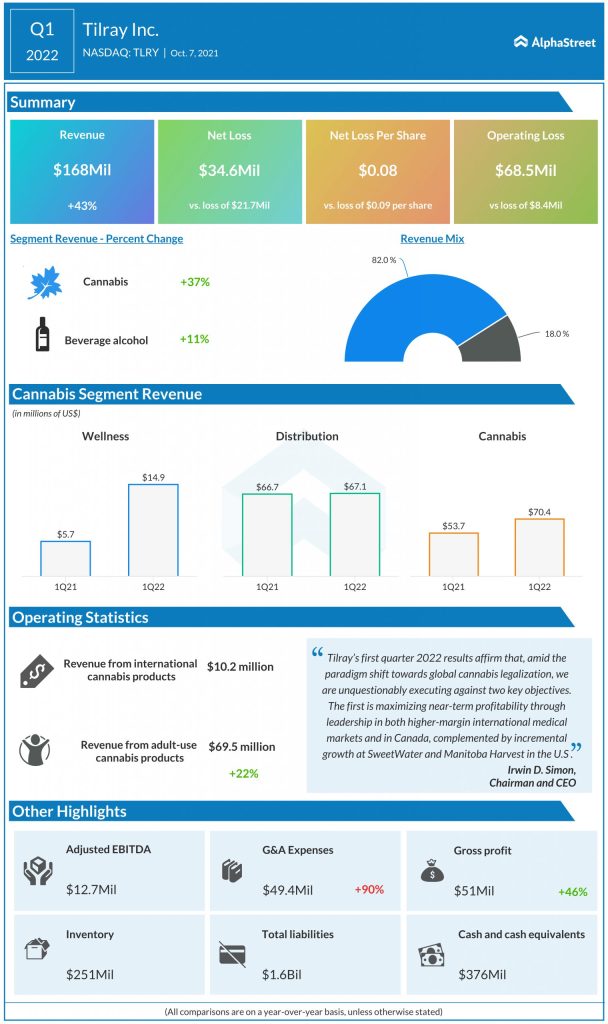 “Tilray (NASDAQ: TLRY) reported first-quarter 2022 financial results after the regular market hours on Thursday. Total net revenue increased 43% year-over-year to $168 million. The company suffered a net loss of $34.6 million, or $0.08 loss per share, compared to the year-ago period.