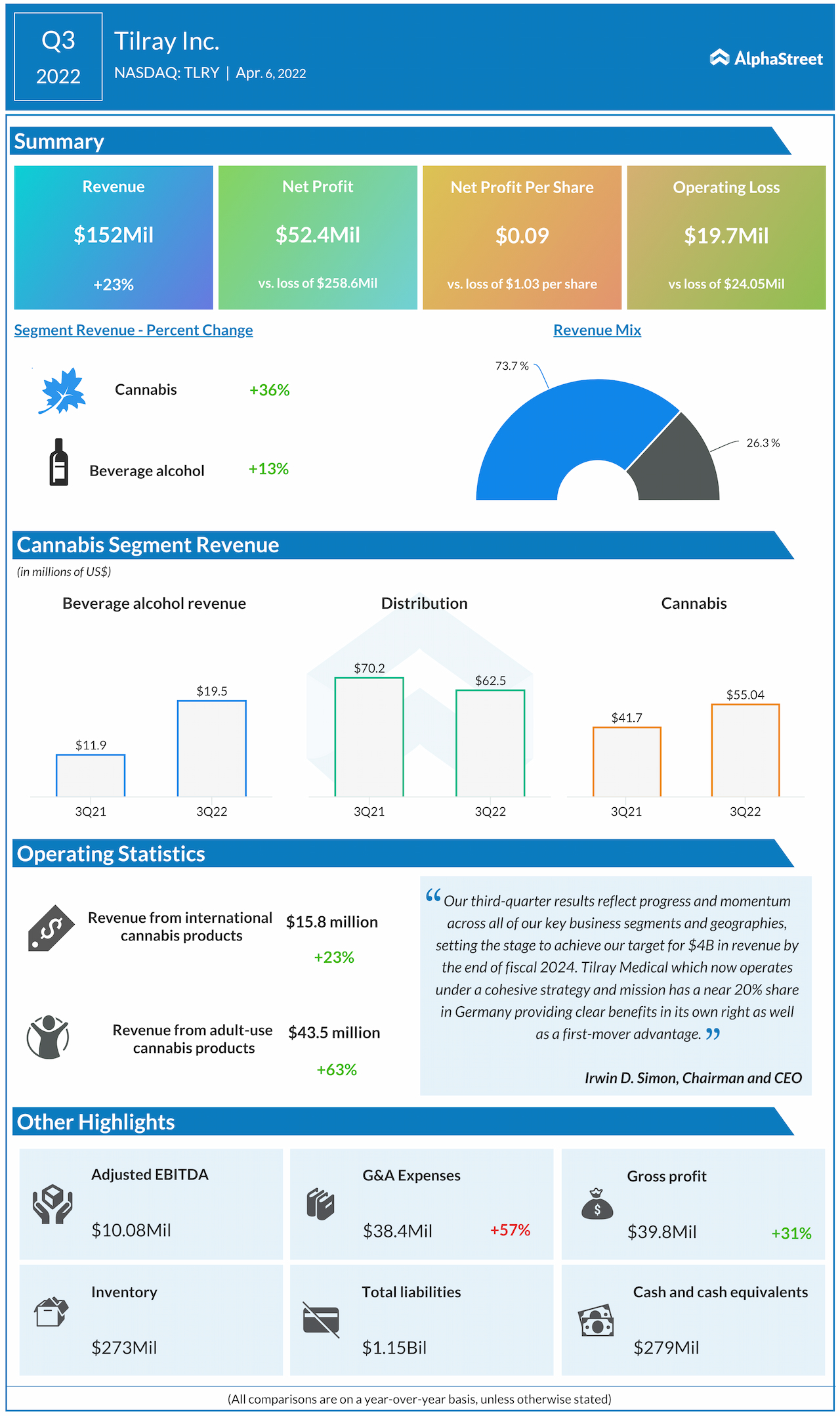 Tilray (NASDAQ: TLRY) reported third-quarter 2022 financial results before the regular market hours on Wednesday.