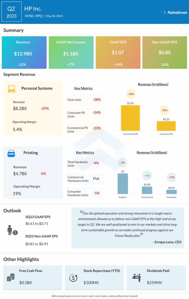 At $12.9 billion, revenues were down 21.7% during the three-month period. Revenues of the main operating segments — Personal Systems and Printing — declined during the quarter.