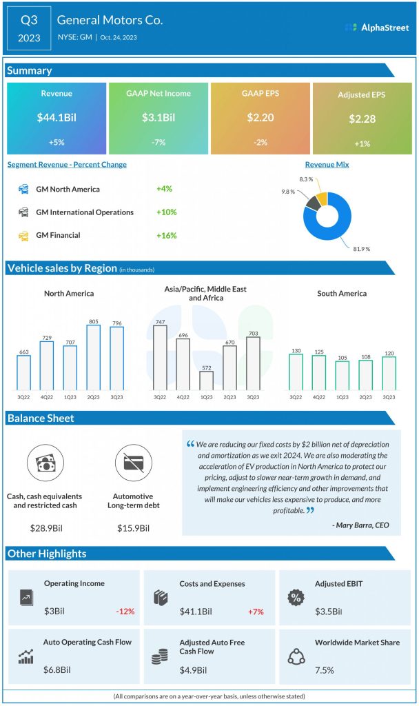 “General Motors Co. (NYSE: GM) reported third quarter 2023 earnings results today. Revenue increased 5.4% year-over-year to $44.1 billion. Net income attributable to stockholders decreased 7.3% to $3.1 billion while EPS fell 2.2% to $2.20 compared to last year. Adjusted EPS rose 1.3% to $2.28. Adjusted EBIT was down 17% to $3.5 billion. Prior performance