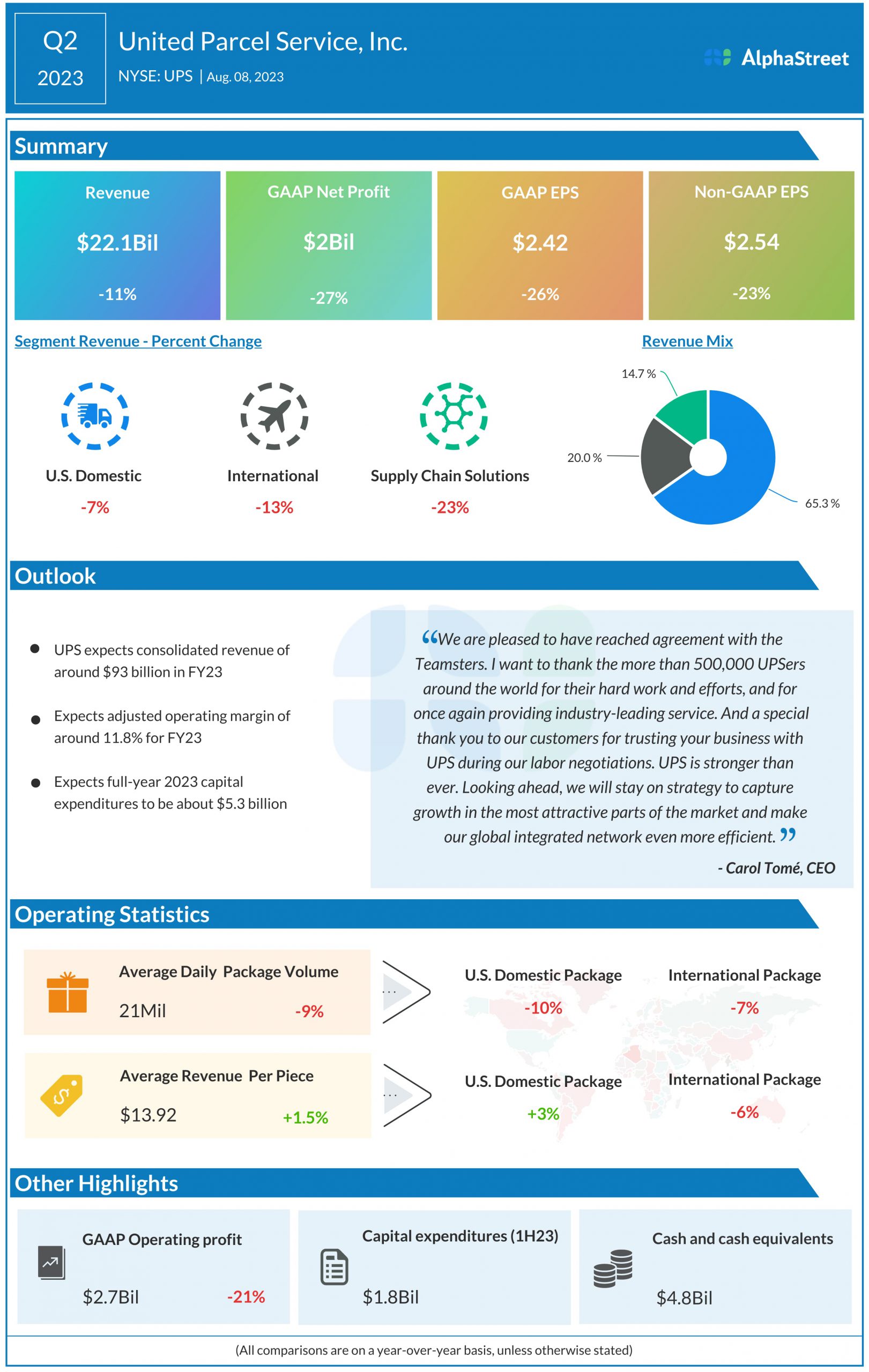 United Parcel Service, Inc. (NYSE: UPS) reported second quarter 2023 earnings results today.