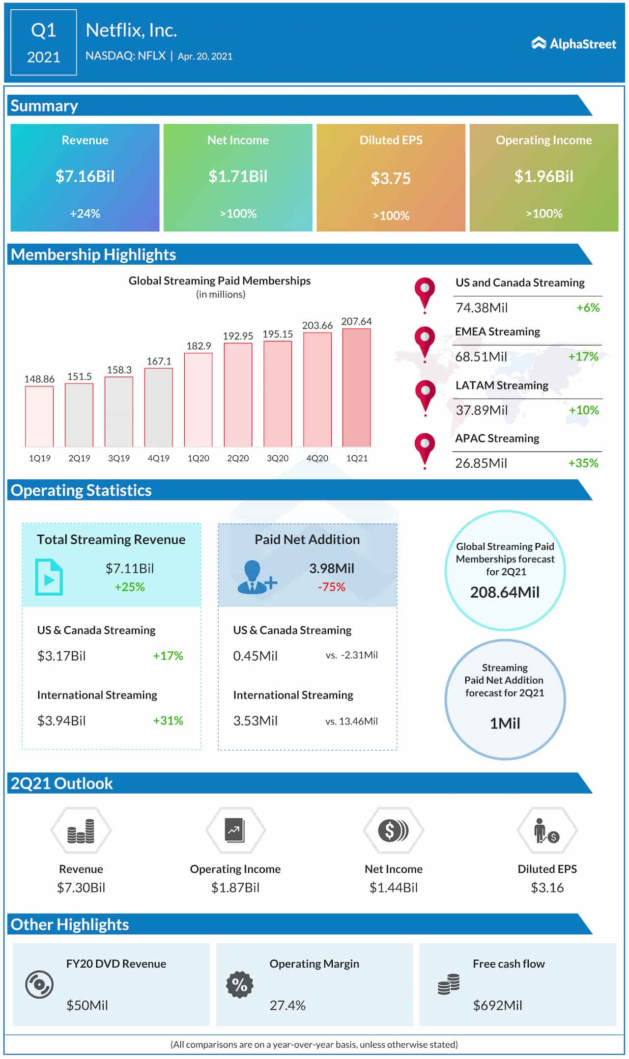 At the end of the first quarter, the company had a total of 207.6 million streaming paid memberships, which is up 14% from last year. Revenues climbed 24% annually to $7.16 billion and exceeded Wall Street’s projection.