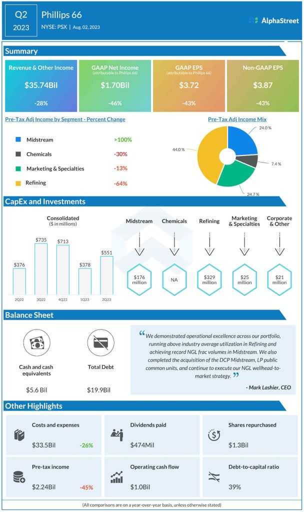 Net income attributable to Phillips 66 was $1.70 billion or $3.72 per share in the June quarter, compared to $3.17 billion or $6.53 per share in the prior-year period. Adjusted earnings declined sharply to $3.87 per share from $6.77 per share last year.