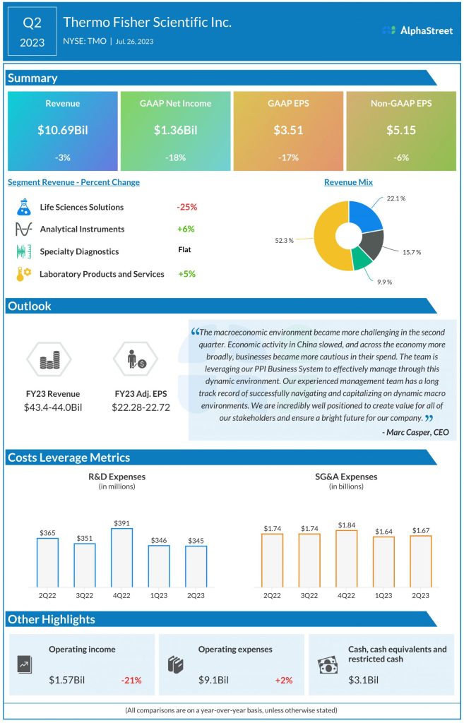 Net income attributable to Thermo Fisher Scientific Inc. was $1.36 billion, or $3.51 per share, compared to $1.66 billion, or $4.22 per share, last year. Adjusted EPS was $5.15.