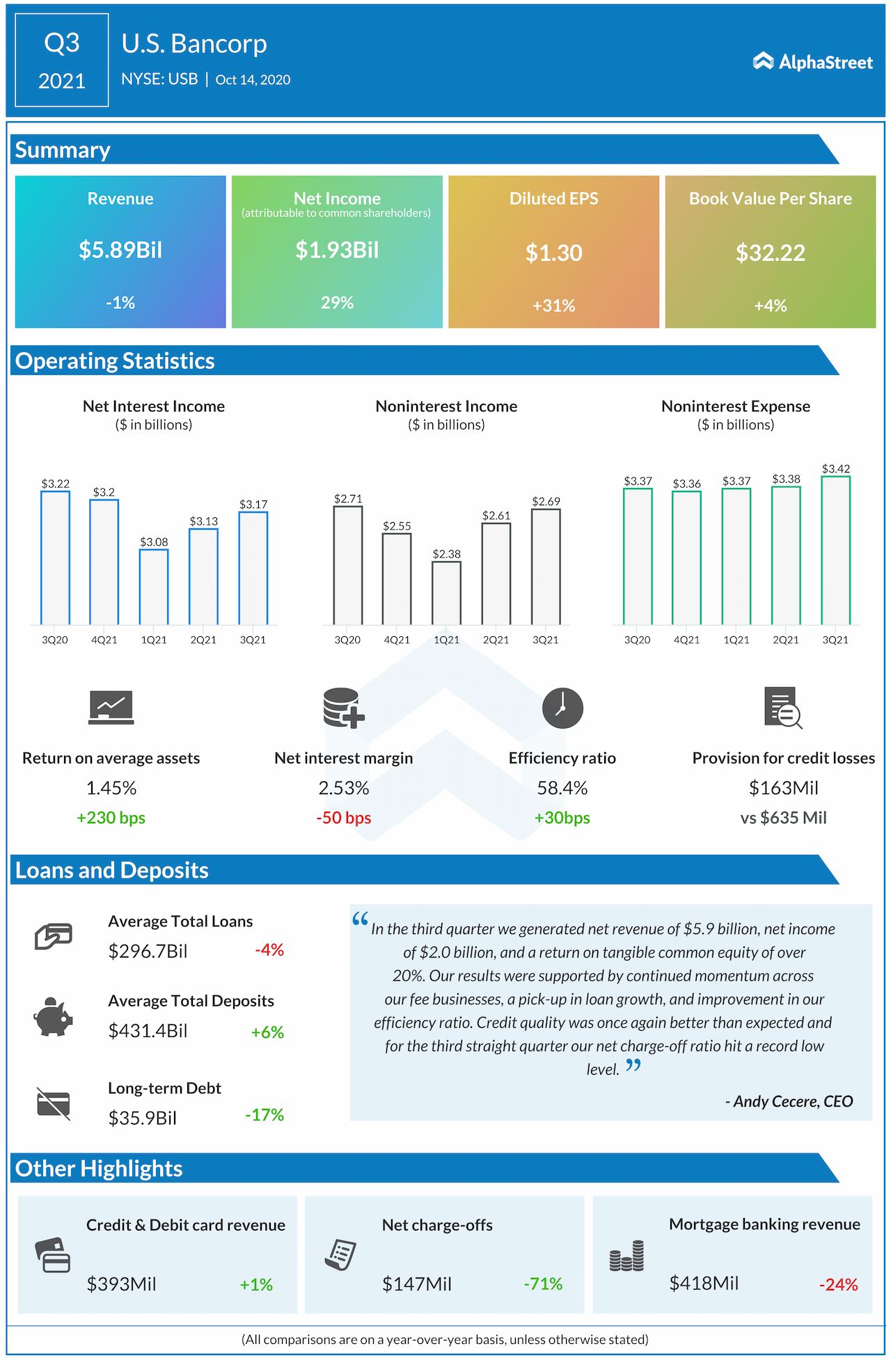 Net income attributable to US Bancorp common shareholders increased to 29% year-over-year to $1.93 billion or $1.30 per share compared to $1.49 billion or $0.99 per share of the same quarter in the previous year.