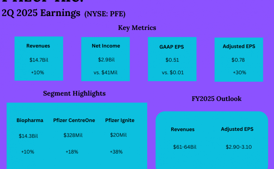 Pfizer Inc. (NYSE: PFE) reported its second quarter 2025 earnings results today. Revenues were $14.7 billion, up 10% year-over-year. Reported net income