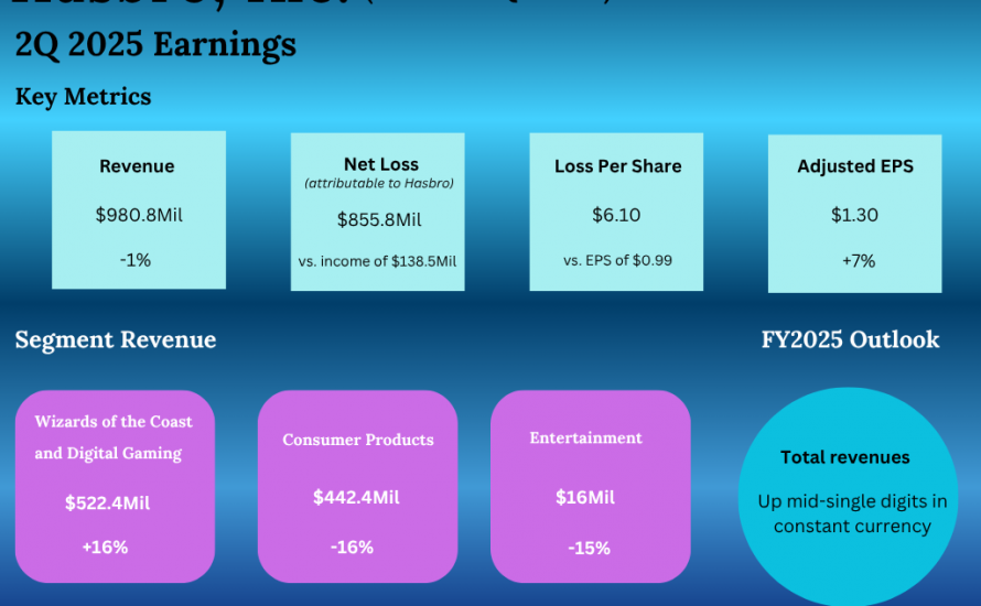 Hasbro, Inc. (NASDAQ: HAS) reported its second quarter 2025 earnings results today. Revenue decreased 1% year-over-year to $980.8 million. Net loss attributable to Hasbro, Inc. was $855.8 million, or $6.10 per share, compared to income of $138.5 million, or $0.99