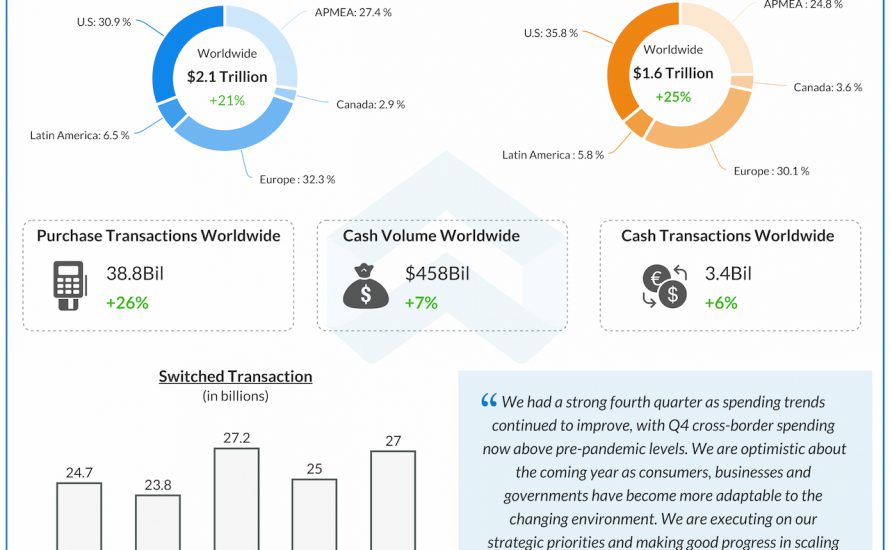 Mastercard Incorporated (NYSE: MA) reported fourth-quarter 2021 earnings results today. Net revenue increased 27% year-over-year to $5.2 billion. GAAP net income rose 33% to $2.4 billion while adjusted net income rose 41% to $2.3 billion from last year. GAAP