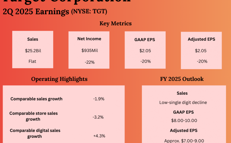 Target Corporation (NYSE: TGT) reported its second quarter 2025 earnings results today. Net sales were $25.2 billion, down slightly versus the year-ago period. Comparable sales decreased 1.9%. Net earnings of $935 million were down 21.5% compared to last year. Earnings per