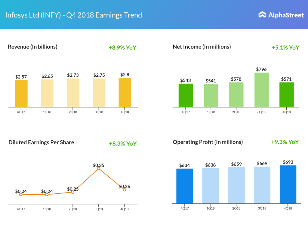 For the fiscal year 2019, Infosys expects revenues to grow 7-9% in dollar terms and 6-8% in constant currency.