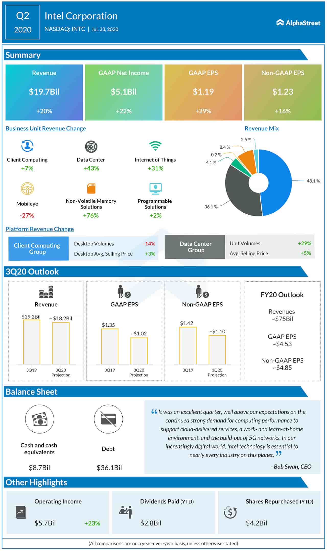 Chipmaker Intel Corporation (NASDAQ: INTC) reported a 20% growth in second-quarter revenues, reflecting the strong demand for cloud services during the COVID-related shutdown. However, the stock declined on Thursday evening due to the weak guidance issued by the management.