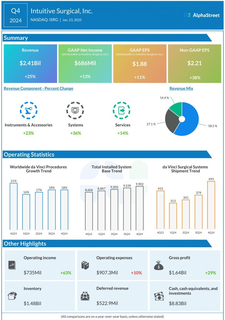 Intuitive Surgical Inc. (NASDAQ: ISRG) reported revenue of $2.41 billion for the fourth quarter of 2024, up 25% from the same period a year ago, driven by growth in da Vinci procedure volume and an increase in the installed base of systems.