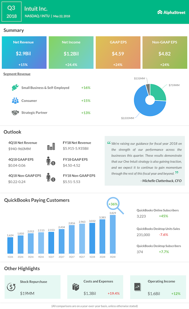 Accounting software QuickBooks Online ended the quarter with 3.2 million users, which is a 45% jump in user subscription over last year. Self-Employed user base nearly doubled to 683,000 users compared to 360,000 in the prior year period.