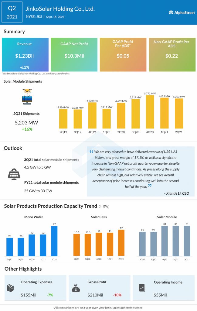 JinkoSolar Holdings Co. (NYSE: JKS) reported second-quarter 2021 earnings results today. Total revenues declined to 6.2% year-over-year to $1.23 billion. Net profit attributable to ordinary shareholders was $10.3 million or $0.05 per share. Adjusted net income was down by 27% at $42.5 million, year on year.