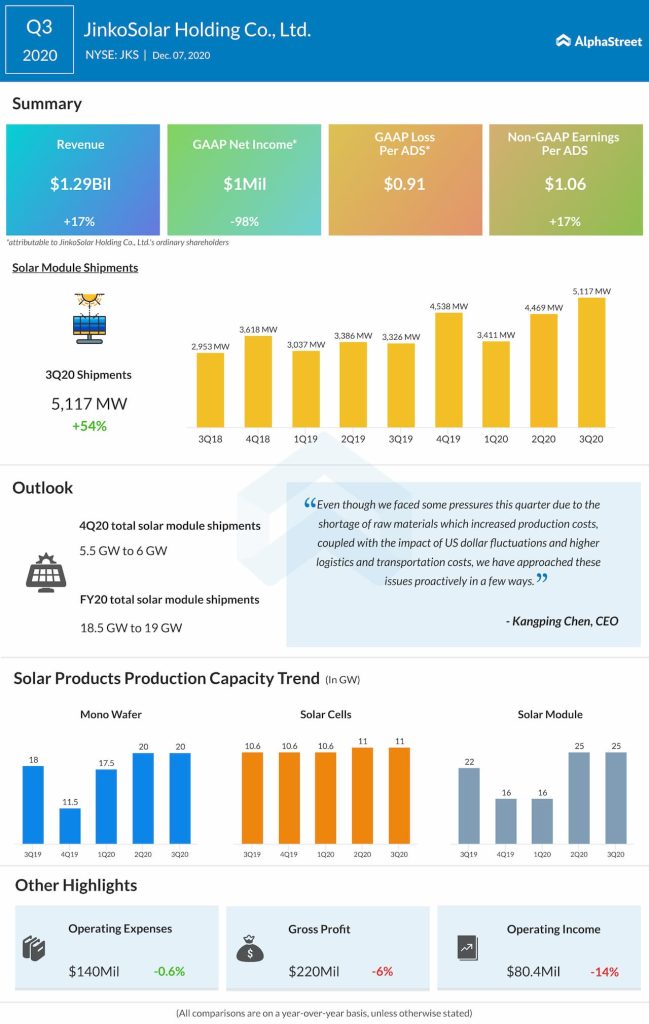 For the fourth quarter of 2020, JinkoSolar expects total solar module shipments to be 5.5 GW to 6.0 GW. Total revenue is expected to range between $1.31 billion and $1.43 billion.