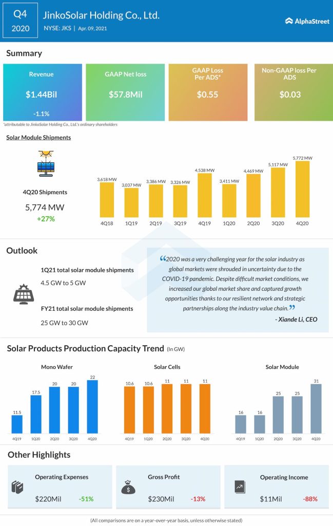 “JinkoSolar Holdings Co. (NYSE: JKS) reported fourth-quarter 2020 earnings results today. Total revenues declined to 1.1% year-over-year to $1.44 billion. Net profit attributable to ordinary shareholders was $5.1 million or $0.55 per share. Adjusted net income was down by 1.2% at $146.9 million, year on year.