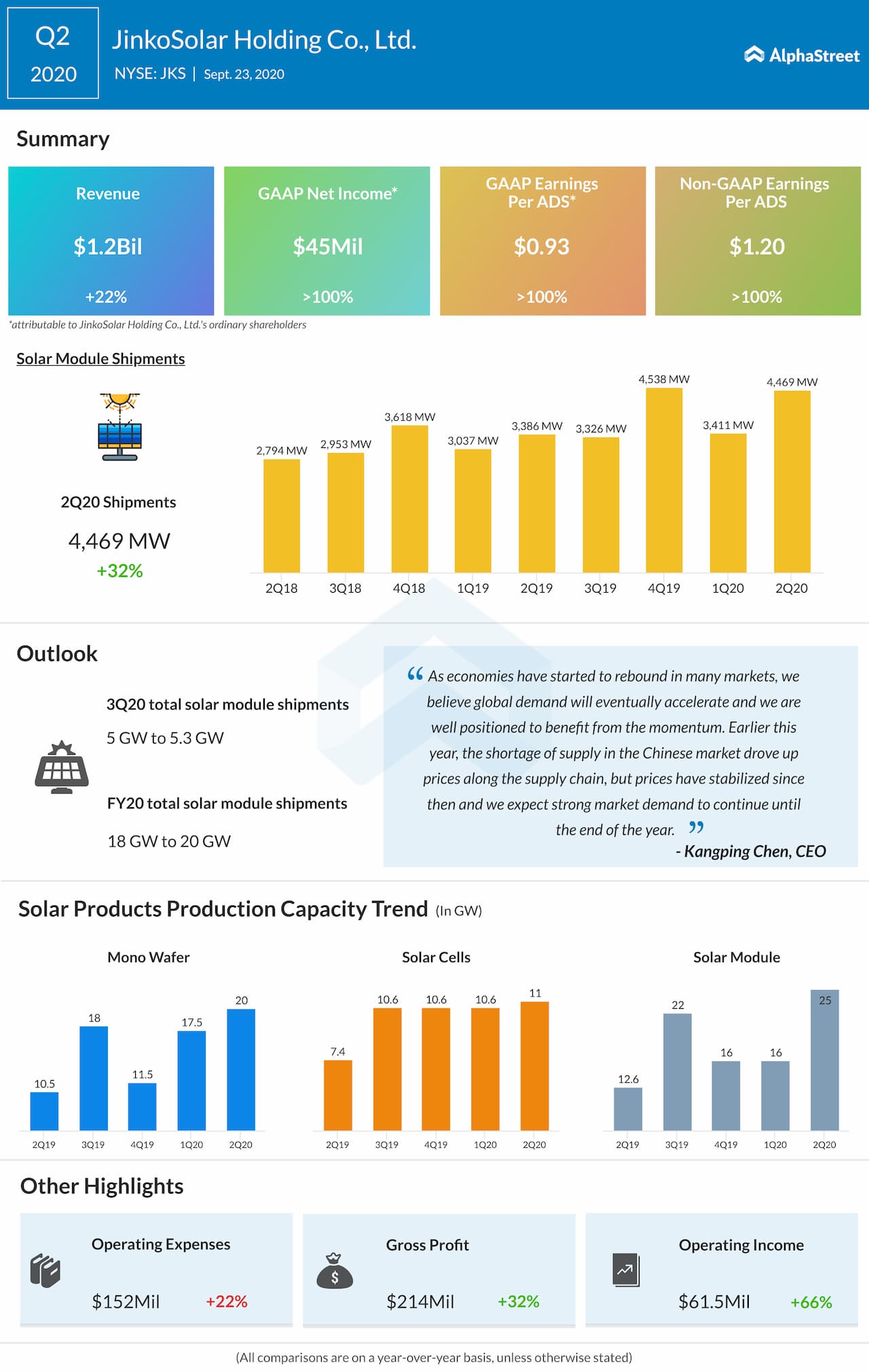 For the third quarter of 2020, JinkoSolar expects total solar module shipments to be in the range of 5.0 GW to 5.3 GW. Total revenue is expected to be $1.22 billion to $1.30 billion. For full year 2020, the company estimates total solar module shipments to be 18 GW to 20 GW.
