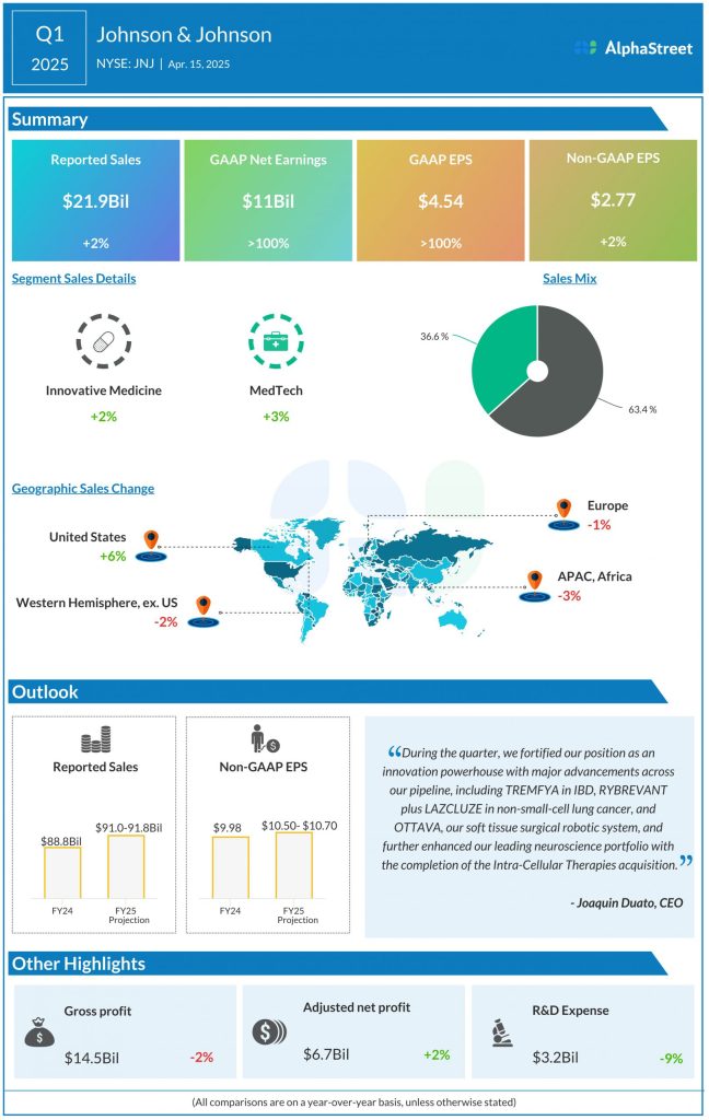 In the first quarter of fiscal 2025, sales increased 2.4% year-over-year to $21.9 billion, with operational sales growing 4.2%. The modest top-line growth translated into a 2.2% rise in adjusted earnings to $2.77 per share. Net income, including special items, moved up to $11 billion or $4.54 per share in Q1 from $3.25 billion or $1.34 per share in the year-ago quarter. Both sales and the bottom line topped expectations, continuing the long-term trend.