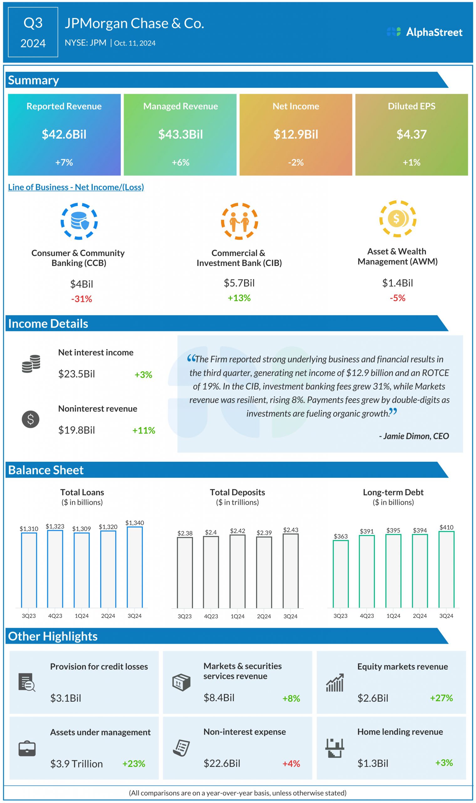 In Q3 2024, JPMorgan’s reported net revenue increased 7% year-over-year to $42.6 billion, beating estimates of $41.7 billion. Net income fell 2% to $12.9 billion. EPS rose 1% YoY to $4.37, surpassing projections of $4.01.
